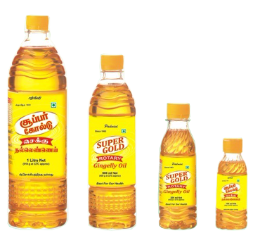 சூப்பர் கோல்டு செக்கு நல்லெண்ணெய் 1 Litre, 500 ML, 200 ML மற்றும் 100 ML பெட் பாட்டில்களில்.